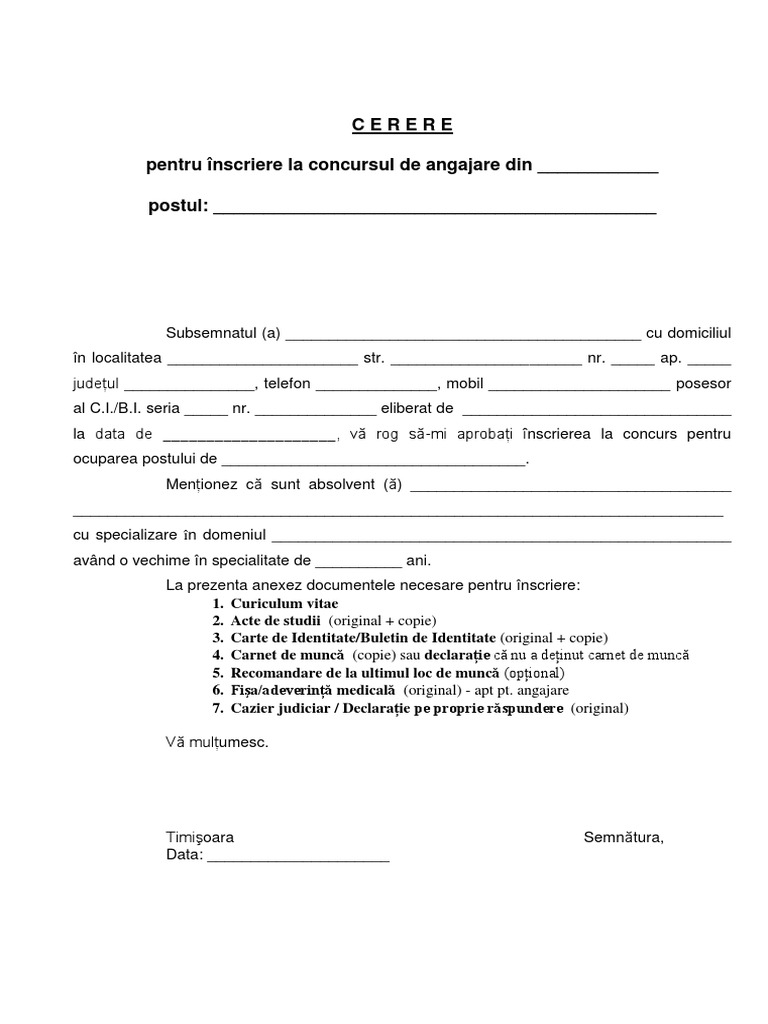 Socială” iar în momentul reîntoarcerii în localitate va prezenta actul medical pentru perioada . Subsemnatul_______________________, domiciliat în localitatea. Documente necesare - Asistent. Asistenţii medicali care întrunesc condiţiile prevăzute în Ordonanţa de Urgenţă nr. MODEL CERERE PARTICIPARE CONCURS. Adeverinţă de angajare sau copie xerox după cartea de muncă.