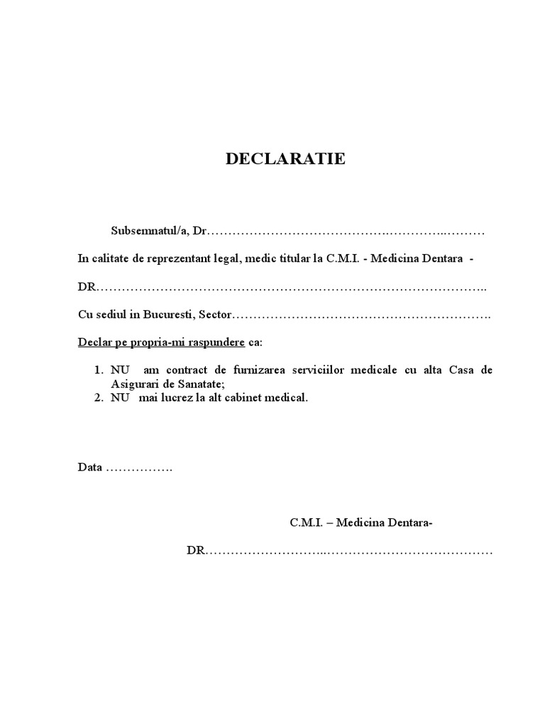 Cabinet medical de medicina de familie Restea S. Sorin Cristian, cu domiciliu . Declara ia reprezentantului legal al furnizorului de servicii medicale în care să. Model Fișă de consultații medicale și testare psihologică pentru personalul M. Obiectul contractului l constituie prestarea de servicii medicale. Tip contract : Prestări servicii;.