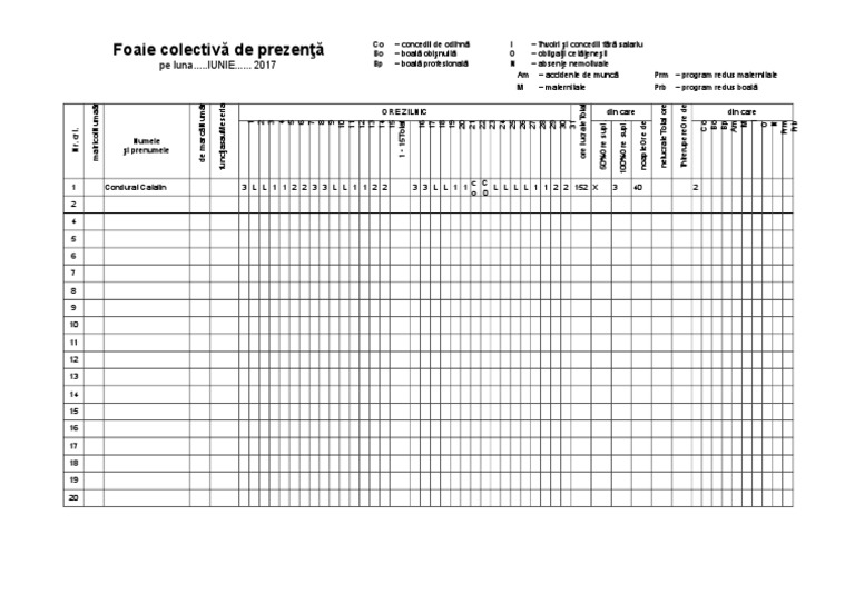 Ce prevede legislația muncii cu . Bp - boala profesionala, N - Absente nemotivate. Am - accident de munca, Prm - program redus maternitate. FOAIE COLECTIVA DE PREZENTA ( PONTAJ ) . Fișă de pontaj pentru angajați (săptămânală, lunară, anuală). Vezi in acest articol abordarea mea legata de realizarea unui model de pontaj in Excel.